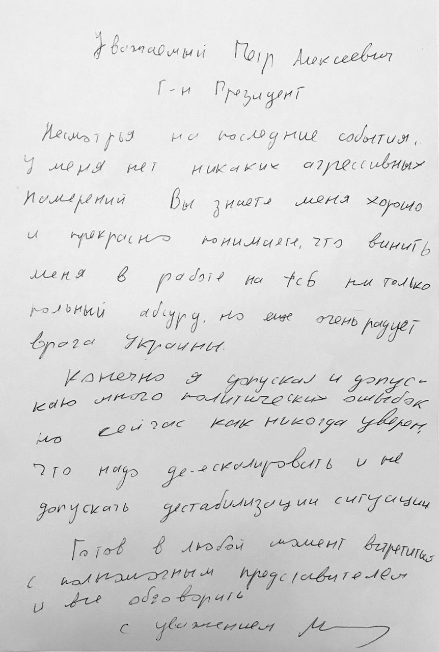 Ուկրաինայի նախագահ Պյոտր Պորոշենկոյի մամուլի քարտուղար Սվյատոսլավ Ցիգալկոն իր թվիթերյան էջում հրապարակել է նամակի բնօրինակը` ձեռագիր գրված, Սահակաշվիլլի ստորագրությամբ:
