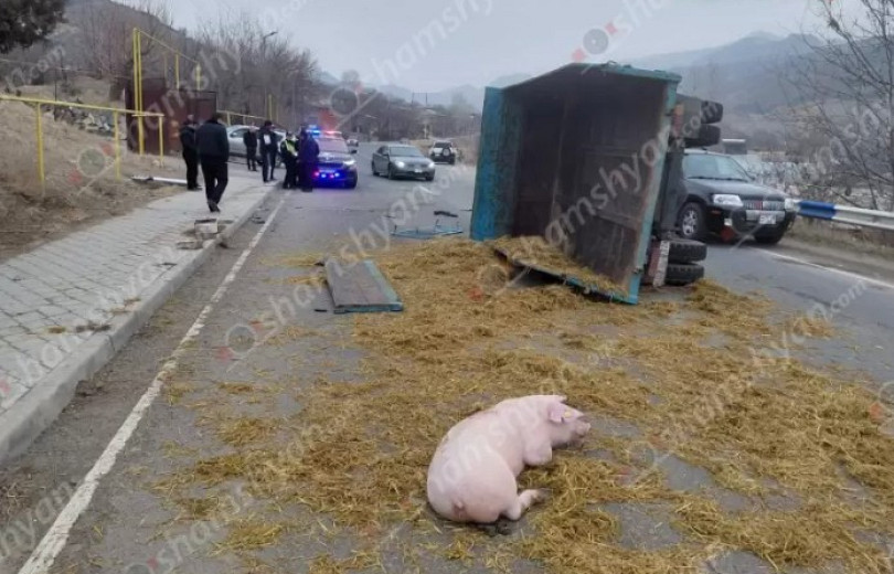 «ԶԻԼ»-ը, որը բարձված է եղել մոտ 30 խոճկորով, կողաշրջվել է՝ հայտնվելով ճանապարհի մեջտեղում՝ երթևեկելի գոտում։