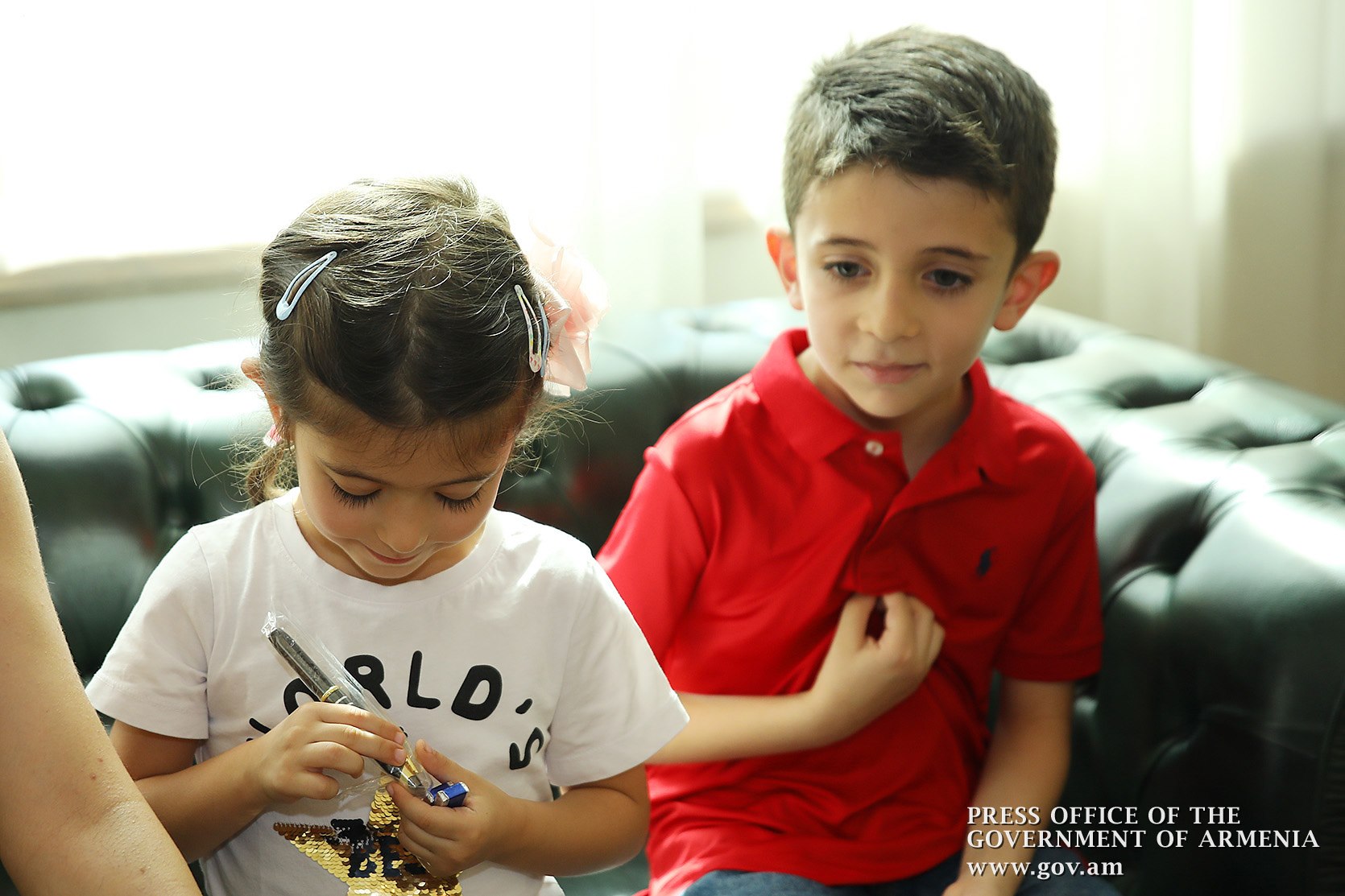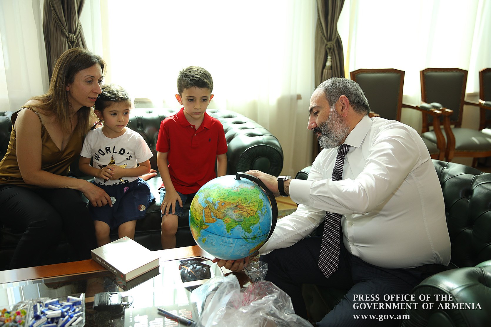 Никол Пашинян побеседовал с малышами, показал им свой кабинет, сфотографировался с ними, подарил им глобус, ручку и кепку с надписями на армянском языке.