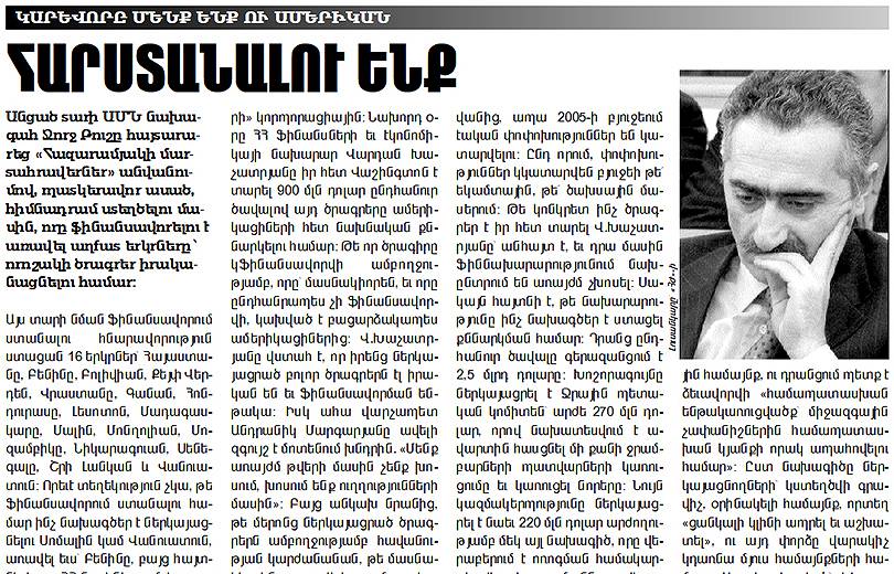 Անցած տարի ԱՄՆ նախագահ Ջորջ Բուշը հայտարարեց «Հազարամյակի մարտահրավերներ» անվանումով, պատկերավոր ասած, հիմնադրամ ստեղծելու մասին, որը ֆինանսավորելու է առավել աղքատ երկրները՝ որոշակի ծրագրեր իրականացնելու համար: Այս տարի նման ֆինանսավորում ստանալու հնարավորություն ստացան 16 երկրներ՝ Հայաստանը, Բենինը, Բոլիվիան, Քեյփ Վերդեն, Վրաստանը, Գանան, Հոնդուրասը, Լեսոտոն, Մադագասկարը, Մալին, Մոնղոլիան, Մոզամբիկը, Նիկարագուան, Սենեգալը, Շրի Լանկան և Վանուատուն: Որեւէ տեղեկություն չկա, թե ֆինանսավորում ստանալու համար ինչ նախագծեր է ներկայացնելու Սոմալին կամ Վանուատուն, առավել եւս՝ Բենինը, բայց հայտնի է, որ ՀՀ-ն ակնկալում է ստանալ միչեւ 900 մլն դոլար՝ առաջիկա 3 տարիների համար: