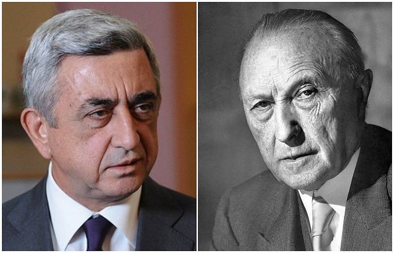 Բայց մի բան էլ կա, որ համեմատելի է Գերմանիայի հետ: Հետպատերազմյան Գերմանիայի առաջին կանցլերը՝ Կոնրադ Ադենաուերը (աջ նկարում) իր պաշտոնում մնացել է 14 տարի՝ 1949 թվականից մինչեւ 1963 թվականը: Կարկառուն ՀՀԿ-ականները Սերժ Սարգսյանին համեմատում են Չերչիլի ու Դե Գոլի հետ, բայց Ադենաուերի անունը չեն տալիս: Հաստատ խաբար չեն, որ այդպիսի գործիչ էլ է եղել: Ճիշտ է, Սերժ Սարգսյանի հետ Ադենաուերի համեմատությունը կսկսվի ու կավարտվի միայն պաշտոնավարման երկար ժամկետով, բայց դա կարեւոր չէ: Կարեւորը որեւէ մեկի հետ համեմատվելն է: Ի դեպ, Գերմանիայի ներկայիս կանցլեր Անգելա Մերկելը պաշտոնավարում է արդեն 12 տարի: Սա էլ հուշում կարկառուն ՀՀԿ-ականների համար: