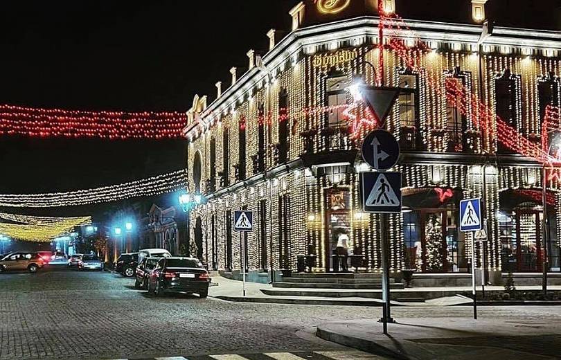 Հրապարակված լուսանկարում տոնական լուսավորությամբ Շիրազի նորակառույց փողոցն է, իսկ շքեղ եւ պայծառ լուսավորված կառույցը՝ Ֆլորենս Գյումրին: