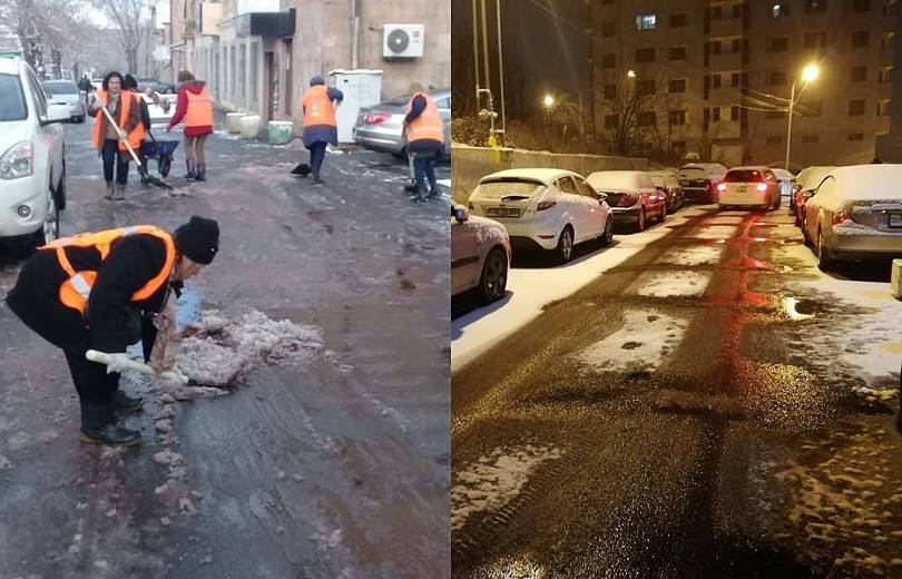 Երեւանի քաղաքապետի խոսնակ Հակոբ Կարապետյանը հայտնեց, որ երեկվա առատ ձնից առաջ աղով եւ ավազով են մշակվել Արաբկիր, Նոր Նորք, Ավան, Քանաքեռ-Զեյթուն վարչական շրջանների խնդրահարույց փողոցները: Աշխատանքն իրականացվել է «Երեւանի աղբահանություն եւ սանիտարական մաքրում» համայնքային հիմնարկի միջոցով: