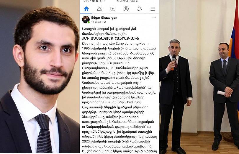 Վայոց Ձորի նախկին մարզպետ, ՀՀԿ Ջերմուկի տարածքային կառույցի նախկին ղեկավար, Լեհաստանում ՀՀ նախկին դեսպան, ՍԴ աշխատակազմի ներկայիս ղեկավար Էդգար Ղազարյանը երեկ ֆեյսբուքի իր էջում «Մի մասնակցեք հանրաքվեին» հեշթեգով գրառում էր կատարել: Ապրիլի 5-ին սպասվող Սահմանադրական փոփոխությունների հանրաքվեն անվանելով կեղծ օրակարգ, մեծ անօրինականություն՝ նա հայտնել էր, թե իր կյանքում առաջին անգամ չի մասնակցելու այդ հանրաքվեին եւ նույնը կոչ է անում իր ընկերներին, բարեկամներին: