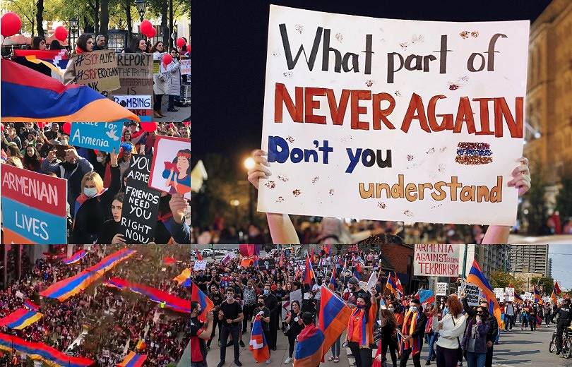 Ամենուր հայկական Սփյուռքը հնչեցրել է Արցախի ճանաչման եւ թուրք-ադրբեջանական ագրեսիան զսպելու պահանջներ: Հայաստանի եւ Արցախի եռագույն դրոշներով երթի ու ցույցի ելած հայերը պարզել են պաստառներ «Արցախը Հայաստան է», «Կրկին 1915-ն է», «Կանգնեցրեք Ալիեւին», «Կանգնեցրեք Էրդողանին», «Խաղաղություն Հայաստանին», «Արցախը հզոր է», «Հայաստանը խաղաղություն է ուզում, Ադրբեջանը՝ Հայաստանը», «Օգնեք եւ պաշտպանեք հայերին», «Սանկցիաներ՝ Թուրքիային», «Հայաստանը՝ համաշխարհային ահաբեկչության դեմ է կռվում», «Հայաստանն իր ընկերների կարիքն ունի հենց հիմա» գրություններով: Առանձնանում է մեկ պաստառ, որ իր ֆեյսբուքյան էջում հրապարակել է Աժ նախագահ Արարատ Միրզոյանը. «Այլևս երբեքի ի՞նչն է անհասկանալի»: