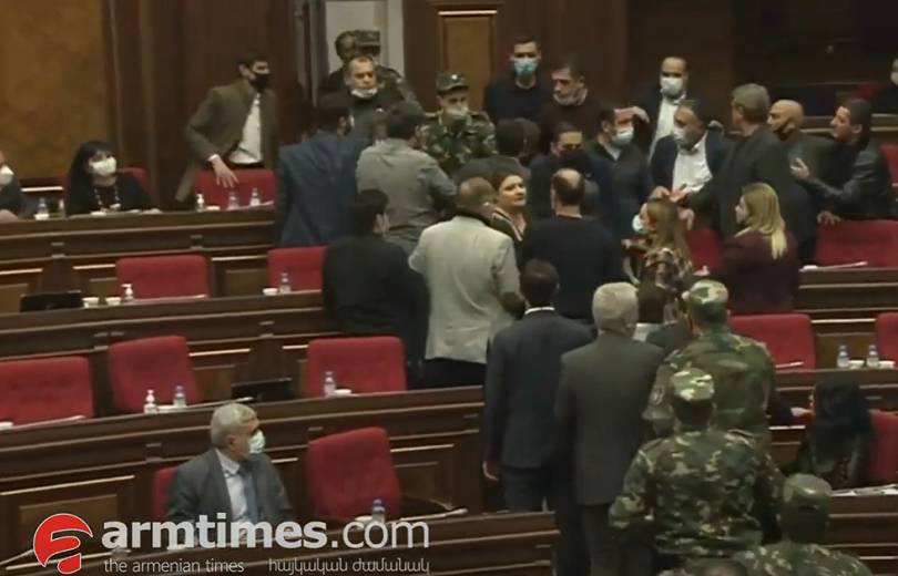 ԱԺ նիստը վարող Ալեն Սիմոնյանը մի քանի անգամ ԲՀԿ-ականներին խնդրեց հանգստացնել իրենց գործընկերներին: «Տիկին Զոհրաբյան, խնդրում եմ մի հրահրեք կրքեր... անվտանգության աշխատակիցներին կանչեք»,- դիմում էր Սիմոնյանը: Ի վերջո, նա ստիպված եղավ անվտանգության աշխատակիցներին ներս հրավիրել: