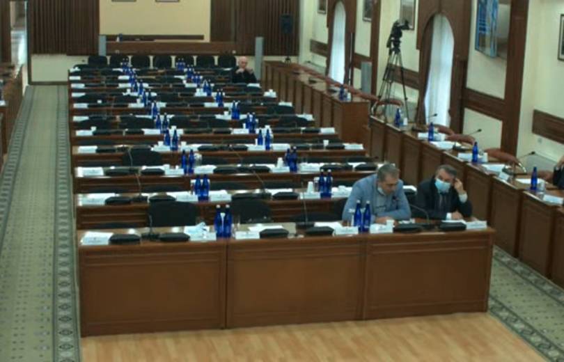 Երեւանի ավագանու նիստերի դահլիճն ընդմիջումից հետո գրեթե դատարկ է. քննարկմանը մի քանի հոգի է ներկա: Օրակարգային հարցերը սպառելուց հետո ավագանու անդամները գնացին ընդմիջման: