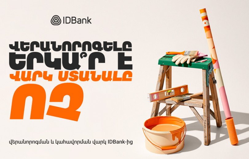 IDBank-ն առաջարկում է ՀՀ դրամով մատչելի ու արագ վարկեր առաջնային շուկայից ձեռքբերված կամ ձեռքբերվող անշարժ գույքի վերանորոգման ու կահավորման համար։ Տրամադրվող վարկի գումարի չափը 2 միլիոնից մինչև 20 միլիոն ՀՀ դրամ է՝ 13․75% անվանական, և 14.50-14.80% տարեկան փաստացի տոկոսադրույքներով, որը հնարավոր կլինի մարել առավելագույնը 120 ամսվա ընթացքում։ Ի դեպ, մինչև 10 մլն ՀՀ դրամի վարկը Բանկը տրամադրում է առանց եկամուտների վերլուծության։