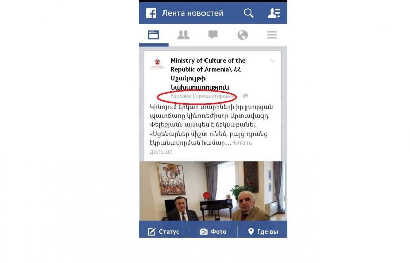 ՀՀ մշակույթի նախարարությունը 2016 թվականի նոյեմբերի 1-ից, նախարար Արմեն Ամիրյանի հանձնարարականով, ֆեյսբուք սոցիալական ցանցում նախարարության ֆեյսբուքյան էջի գրառումները գովազդում է: Այս մասին Armtimes.com-ի հարցմանն ի պատասխան տեղեկացրեցին մշակույթի նախարարության Ֆեյսբուքի պատշոնական էջի պատասխանատուները: