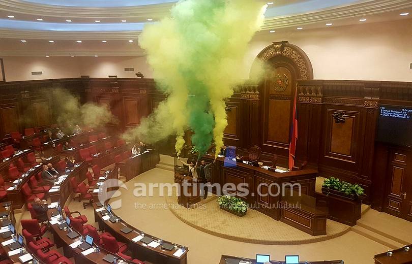 К Арарату Мирзояну подошла Лена Назарян с двумя дымовыми файерами в руках, и зал заседаний НС заполнился цветным дымом.