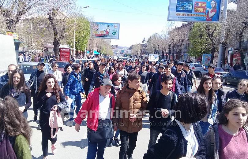 Сотни жителей города Ванадзора проводят шествие по улицам города к центру – к площади Айка. В акции участвуют в основном школьники, студенты, объявившие забастовку.