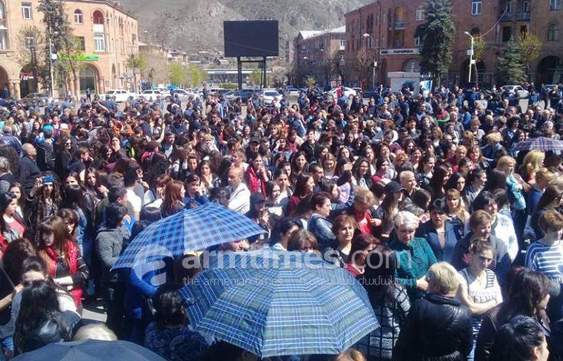 В Ванадзоре число демонстрантов достигает нескольких тысяч. На центральной площади – площади Айка, иголке негде упасть, к участникам акции присоединились крупная швейная фабрика «Глория», сотни работников, тысячи школьников и студентов.