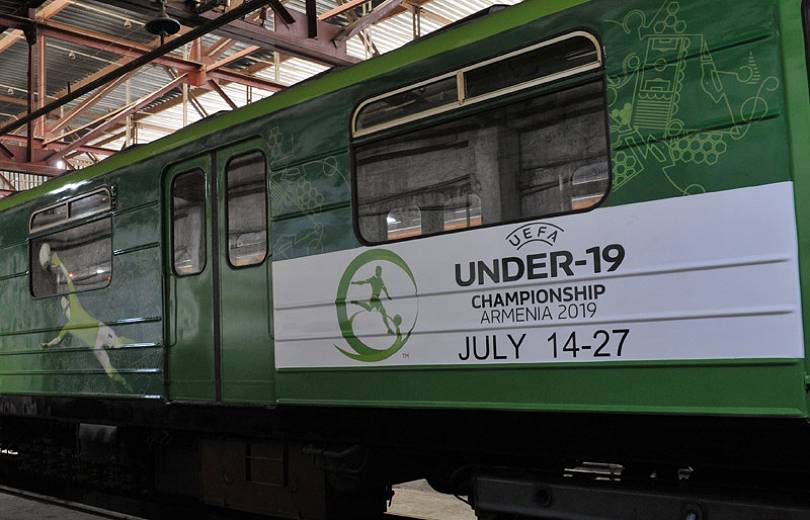 «Футбольный» поезд, окрашенный в цвета финального турнира чемпионата Европы по футболу М-19, который состоится 14-27 июля в Ереване, будет обслуживать пассажиров Ереванского метрополитена три месяца подряд – до начала и в течение всего финального турнира.