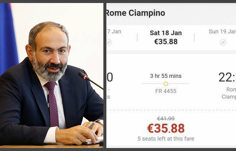 Премьер Армении Никол Пашинян опубликовал на своей странице в фейсбуке стоимость билета на один из рейсов новичка на армянском рынке – авиакомпании Ryanair. Речь идет о рейсе Ереван-Рим, билет на него стоит 35,88 евро.
